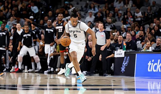 本场比赛中,马刺的先发控卫斯蒂芬-卡斯尔(Stephon Castle)的表现还是相当不错的。卡斯尔全场出场35分18秒,投篮12中7,三分线外4中2,罚球7中5,得到了21分6篮板8助攻4抢断1盖帽的数据,还有2次失误和4次犯规,正负值为+9。卡斯尔在进攻端也是保持了稳定的进攻效率,他不仅突破犀利,而且他在外线投篮方面的手感也还算不错 卡斯尔在传球和组织方面也是发挥出了自己的实力,而且他也是控制了自己的失误数并且打出了超高的助攻失误比。卡斯尔在防守端的表现同样是可圈可点的,他也是有着超强的个人防守能力,他的防守强度极高,防守侵略性极强,他在防守端的贡献度也是有目共睹的。卡斯尔在攻防两端都打出了极其出色的表现,这也是球队面对近来势头不错的热火依然能够取得一场胜利并且保持连胜势头的重要因素。